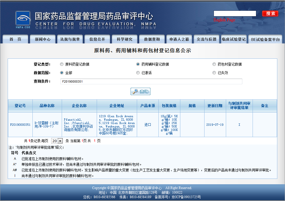 Pfanstiehl拳頭產(chǎn)品之一,D-甘露醇(M-109-7)CDE登記號F20190000351已在CDE網(wǎng)站公布: