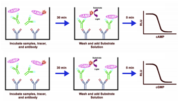 G蛋白是細胞內(nèi)的重要調(diào)控因子,參與細胞運動、代謝和轉(zhuǎn)錄等生理過程,它通過一系列膜結(jié)合受體觸發(fā)細胞內(nèi)的級聯(lián)反應來參與調(diào)節(jié)各種細胞外信號。而調(diào)控G蛋白信號級聯(lián)反應的關鍵是“第二信使”,即環(huán)磷酸腺苷(cAMP)和環(huán)磷酸鳥苷(cGMP)。這兩種分子的關鍵功能之一是激活鳥嘌呤交換因子(GEF),而GEF反過來又在G蛋白的活化中發(fā)揮作用。因此,檢測cAMP / cGMP水平,是研究細胞內(nèi)眾多信號通路必不可少的實驗之一。美國Cell Biolabs公司提供了一種穩(wěn)定、高效的檢測cAMP/cGMP濃度的試劑盒,其采用競爭ELISA的方法,檢測靈敏度可達1 pmol/mL,并且試劑盒特異性強,不與其他第二信使發(fā)生顯著交叉反應,適用于檢測的樣品類型廣泛,包括細胞/組織裂解液、唾液、尿液、血清和細胞上清等。