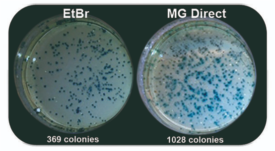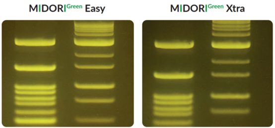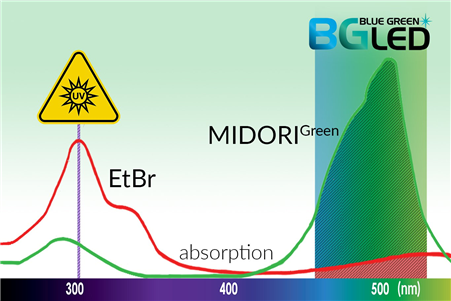 紫外光與EtBr染色至今仍一起被用于分子生物學(xué)實驗室中檢測核酸。然而紫外光譜會導(dǎo)致DNA樣品的修飾和降解,30秒的紫外線曝光足以大幅降低克隆效率。藍(lán)/綠LED在470 nm - 520 nm處發(fā)出安全可見光,這種光譜對 DNA 沒有破壞性,與紫外光相比,DNA完整性和克隆/測序效率完全不受影響,即使在長時間的光照下也是如此。MIDORIGreen系列核酸染料經(jīng)過優(yōu)化,可在紫外光或藍(lán)/綠光激發(fā)時獲得更亮的信號,同時也兼容紫外光。