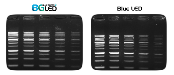 圖3:使用MIDORI Green Xtra檢測的DNA條帶具有超高靈敏度(注:左圖使用藍(lán)色/綠色 LED 透射儀進行檢測;右圖使用藍(lán)色LED透射儀進行檢測。)