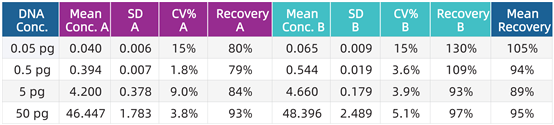 準(zhǔn)確性與可重復(fù)性測(cè)試。由兩名操作員(A和B)分別在兩天內(nèi)對(duì)已知DNA樣本進(jìn)行兩次檢測(cè),計(jì)算檢測(cè)結(jié)果的SD, CV和回收率%(見下表)。