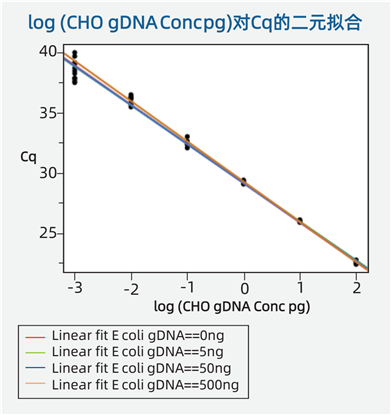 存在外源DNA的情況下,CHO引物/探針仍具有廣泛的線性范圍和特異性。不同濃度的E. coli DNA不會(huì)影響CHO DNA的標(biāo)準(zhǔn)曲線(如下圖)。