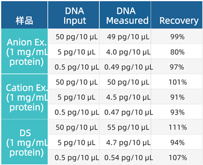 過程樣品與藥物原液(DS)檢測(cè)結(jié)果對(duì)比。對(duì)比含有1 mg/mL陰離子交換或陽離子交換純化的蛋白樣品或藥物蛋白的CHO DNA回收率(見下表)。