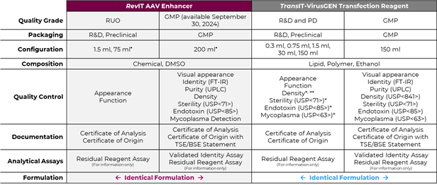 自2023年7月底Mirus上市RevIT? AAV Enhancer以來,RevIT? AAV Enhancer的加入允許不同血清型AAV病毒基因組滴度提高1.2-4.9倍,并且在一定程度提升了實(shí)心率,使得AAV生產(chǎn)上游成本進(jìn)一步降低成為可能,降低了基因治療單劑量成本。由于可輕松靈活的將RevIT整合入現(xiàn)有AAV生產(chǎn)工藝工作流程中,不僅可以搭配Mirus TransIT-VirusGEN® GMP 轉(zhuǎn)染試劑,也適配于其他轉(zhuǎn)染試(如PEI),RevIT? AAV Enhancer得到了國(guó)內(nèi)外AAV客戶的廣泛認(rèn)可及好評(píng),GMP級(jí)別試劑也按照計(jì)劃如期上市,用于大規(guī)模的AAV GMP生產(chǎn)。
