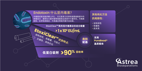 本文將推薦一款來自英國Astrea Bioseparations的Etoxiclear?層析介質,它是一種高性能、非離子交換、合成的親和層析吸附劑,可經濟高效地去除內毒素,支持GMP生產,有凝膠和一次性預裝柱兩種形式產品,滿足不同的工藝需求。