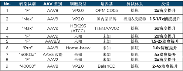 Mirus Bio成立于1996年,在核酸遞送領(lǐng)域深耕多年,于2021年8月推出GMP級別TransIT-VirusGEN® GMP 轉(zhuǎn)染試劑,支持AAV及LV從科研到GMP商業(yè)化生產(chǎn)。不同于傳統(tǒng)基于單組分的轉(zhuǎn)染試劑(如陽離子聚合物聚乙烯亞胺,PEI),Mirus Bio將專利的多聚物及脂質(zhì)技術(shù)進(jìn)行多重組合,形成多功能性的轉(zhuǎn)染方案,克服細(xì)胞遞轉(zhuǎn)過程中的多重阻礙,以實現(xiàn)更高效轉(zhuǎn)染和更低細(xì)胞毒性,從而大幅度提升多種血清型AAV病毒生產(chǎn)載量。去年7月底Mirus上市RevIT? AAV Enhancer,已證明在不同AAV血清型別中,可提高AAV病毒基因組滴度1.2-4.9倍,并且在一定程度改善了實心率。更重要的是,RevIT? AAV Enhancer不僅可以搭配Mirus TransIT-VirusGEN® GMP 轉(zhuǎn)染試劑,也適配于其他轉(zhuǎn)染試(如PEI等),使得AAV生產(chǎn)上游成本的進(jìn)一步降低成為可能,進(jìn)而降低了基因治療單劑量成本。下圖展示了國內(nèi)客戶前期測試反饋結(jié)果,測試包括了不同血清型別的質(zhì)粒設(shè)計,適用于國內(nèi)及國外品牌的轉(zhuǎn)染試劑、細(xì)胞及培養(yǎng)基體系,實現(xiàn)了1.5-4倍以上的AAV病毒滴度提升。