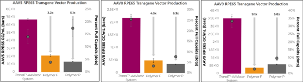 使用不同的質(zhì)粒設(shè)計(GFP基因-圖3;RPE65 基因-圖4),平行比較TransIT®-AAViator 轉(zhuǎn)染系統(tǒng)與“Poly F”(Polyplus FectoVIR® 病毒轉(zhuǎn)染試劑)以及“Poly P” (Polyplus PEIpro®病毒轉(zhuǎn)染試劑)。實驗結(jié)果顯示,在不同AAV血清型別中 (AAV5、8、9),TransIT®-AAViator 轉(zhuǎn)染系統(tǒng)有著更高的病毒滴度及實心率,當(dāng)質(zhì)粒設(shè)設(shè)計替換成治療性基因(RPE65 基因),病毒滴度及實心率相比于競爭品牌,其優(yōu)勢更加顯著。