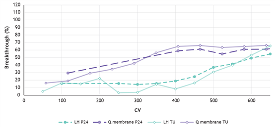 下圖是VSV-G LVV樣品在不同流速下通過LentiHERO(LH)與Q膜流穿液的TU和p24檢測結(jié)果,LentiHERO對LVV的結(jié)合能力顯著高于Q膜。由此表明,LeniHERO在LVV流穿之前能夠處理更大體積的料液。