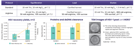 用0.8M精氨酸洗脫,HSV回收率可達到69%,LentiHERO®載量可達1.4E+8 IU/ml,同時實現(xiàn)高效的雜質(zhì)去除。