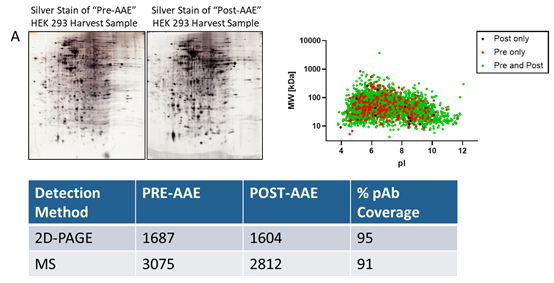 The advantages of AAE? technology lie not only in its high sensitivity, but also in its robust predictive capability and broad application prospects. The coverage results obtained through AAE-MS? are higher and more authentic, enabling more accurate prediction of the performance of anti-HCP antibodies in ELISA. Moreover, the combination of AAE? with mass spectrometry (AAE-MS?) can identify HCPs in harvest materials that react with antibodies, and obtain information on the molecular weight and isoelectric point (pI) of the proteins. This makes it possible to assess individual HCPs that persist during the purification process and optimize downstream purification procedures.